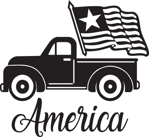 Description Decal of a vintage truck carrying the American flag with the word “America” below it