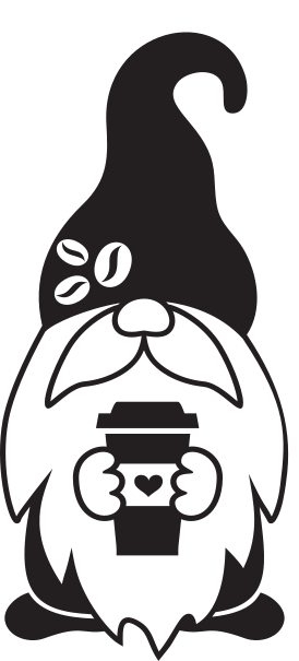 Decal of a gnome in a hat holding a coffee cup