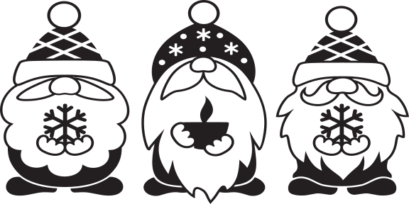 Decal of 3 gnomes holding snowflakes and a hot chocolate