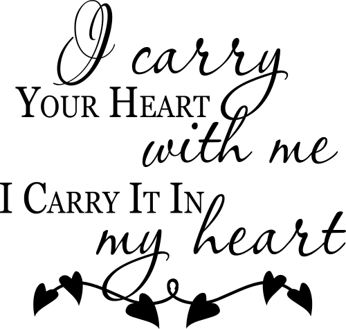 Decal of the words “I carry YOUR HEART with me I Carry It In my heart” with hearts on a string