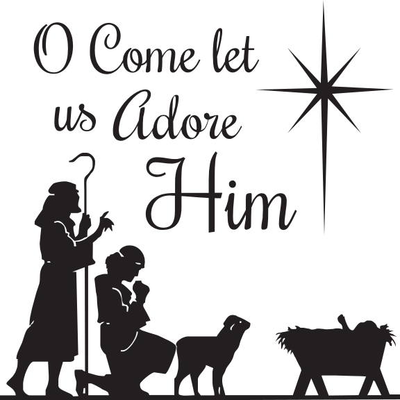 Decal of baby Jesus, wise men, and a lamb with the words “O Come let us Adore Him”