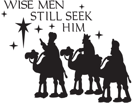Decal of the words “WISE MEN STILL SEEK HIM” with 3 wise men riding camels and stars